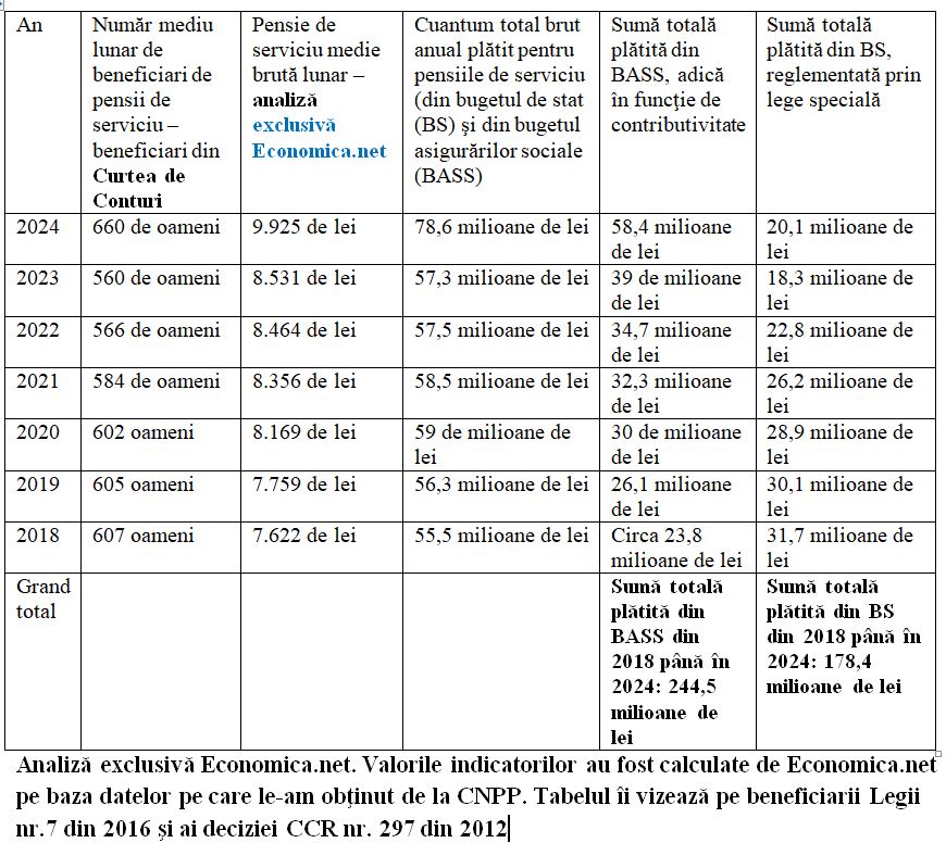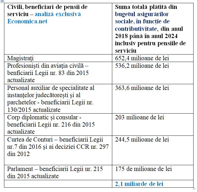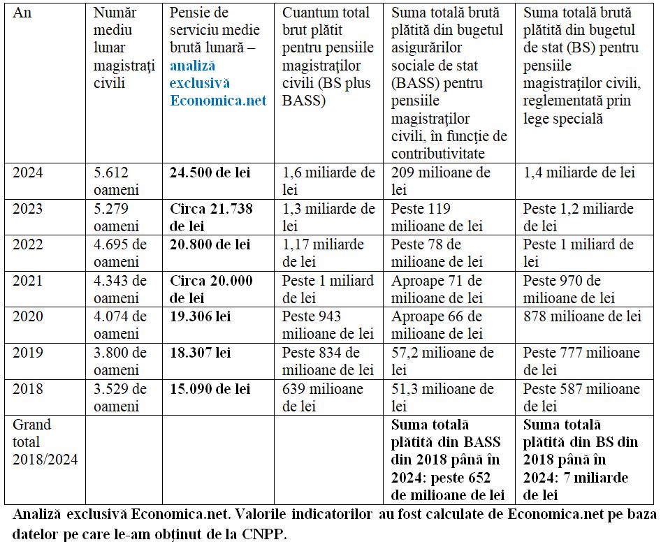 Privilegiul legilor speciale care le reglementează pensia de serviciu celor aproximativ 11.500 de pensionari civili le-a mai adus nemeritat încă 8,7 miliarde de lei la pensie, în perioada anilor 2018 – 2024 inclusiv, reiese din ampla analiză Economica.net. Cea mai mare sumă din bugetul de stat, fără vreo legătură cu principiul contributivităţii, ci doar urmare a legiferării privilegiului – circa 7 miliarde de lei din bugetul de stat – a fost virată doar pentru pensiile speciale ale magistraţilor civili, arată analiza Economica.net.