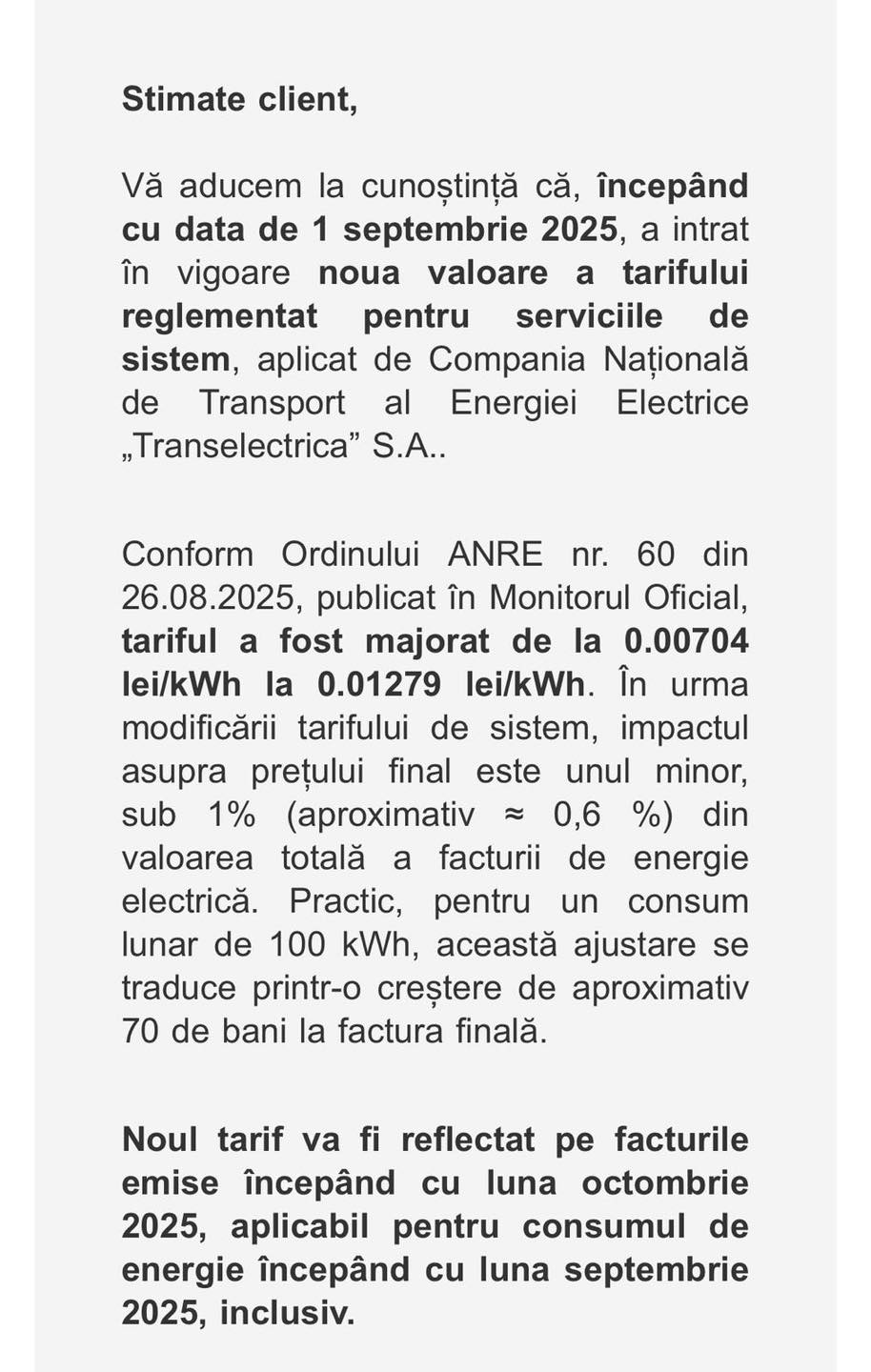 La începutul săptămânii, Hidroelectrica a transmis o informare clienților săi, potrivit căreia a mărit ușor prețul energiei din factură ca urmare a creșterii tarifelor reglementate pentru serviciile de sistem, stabilite prin Ordinul Ministrului Energiei nr. 60 din 26.08.2025 și aplicate de Compania Națională de Transport al Energiei Electrice „Transelectrica” S.A..