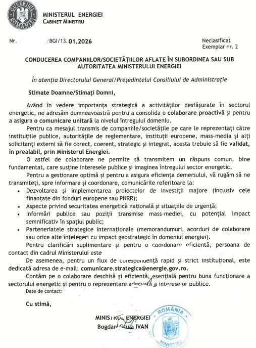 “Pentru ca mesajul transmis de companiile/societățile pe care le reprezentați către instituțiile publice, autoritățile de reglementare, instituții europene, mass-media și alți solicitanți externi să fie corect, coerent, strategic și integrat, acesta trebuie să fie validat, în prealabil, prin Ministerul Energiei”, scrie în circulara emisă în data de 13 ianuarie 2026 și semnată de ministrul Energiei, Bogdan Ivan.