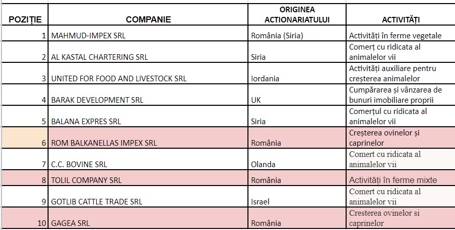 În afară de Mahmud Impex SRL ai căror acționari sunt de origine siriană, în clasamentul celor mai mari 10 exportatori de animale vii există doar trei entități cu acționariat local care se ocupă inclusiv de creșterea animalelor, nu doar de exportul lor.
