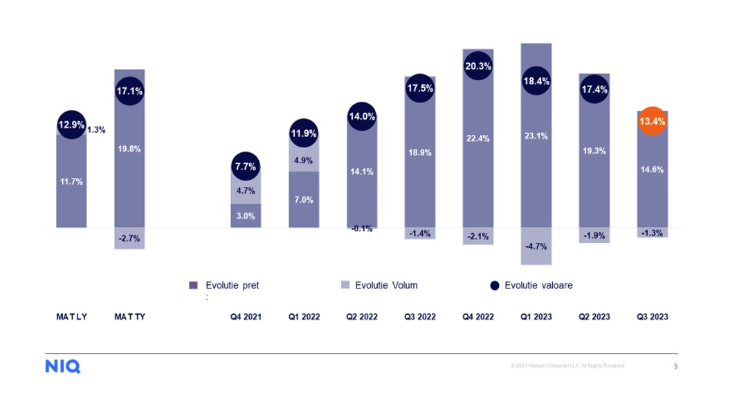 „Consumatorii se confruntă, încă o dată, cu un sezon de sărbători marcat de un cost de trăi ridicat. Cu toate că există o decelerare a ratei inflației în sectorul de bunuri de larg consum, acest lucru nu duce, totuși, la o reducere a cheltuielilor cu produsele alimentare. Această tendința este reflectată în datele recent publicate de NielsenIQ (NIQ), care arată că sectorul de FMCG se confruntă în continuare cu o scădere de volume manifestată mai ales în hypermarketuri și în comerțul tradițional (-5.4%, respectiv -4.0% în volum, în ultimele 12 luni, față de cele 12 luni precedente)”, spun anali;tii Nielsen.