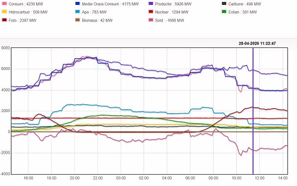 Azi la ora 11,22, producția instantanee a parcurilor fotovoltaice dispecerizabile, măsurată de Transelectrica, se ridica la 2.397 MW. Adică mai mult de 40 % din toată producția de energie a țării la acel moment și mai mult de jumătate din consumul din rețele.