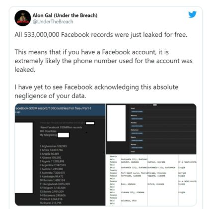 Datele personale a mai mult de o jumătate de miliard de utilizatori Facebook au fost publicate online sâmbătă. Scurgerea de informații include datele personale a 533 de milioane de utilizatori ai platformei de socializare cum ar fi numere de telefon, ID-uri Facebook, nume complete, adrese, zile de naștere, biografii și, în unele cazuri, adrese de e-mail.
