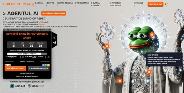 MIND of Pepe este un alt proiect inspirat de mascota Pepe the Frog care câștigă atenția investitorilor de meme coins. Acesta a reușit să adune un capital de un milion de dolari în mai puțin de 24 de ore. În prezent, cifra s-a dublat până la peste 2,5 milioane de dolari.
