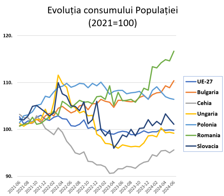 Consumul continuă să fie extrem de alert, chiar cel mai alert din regiune, așa cum remarca de curând cursdeguvernare.ro în graficul de mai jos. Creșterea vânzărilor cu amănuntul în România accelerează în comparație cu indicatorii similari din alte țări din regiune, care dau semne de încetinire.