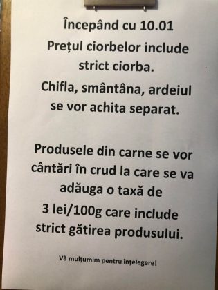 „Venise ora de prânz și m-am gândit să mă duc pe strada Dunării, să mănânc la Moldovan, unde mâncasem întotdeauna porția de ceafă cu cartofi prăjiți, maxim 20 de lei plăteam întotdeauna. Azi am decis să cumpăr piept grill tot cu cartofi. Carnea 11 lei, cartofii 7, scăpasem iarăși sub 20 de lei. Preț final?! 27 de lei…