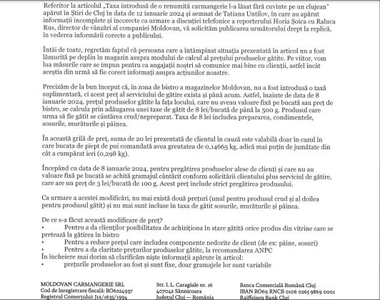 Nu a fost singura reacție a Carmangeriei Moldovan la articolul publicat de Știri de Cluj, aceasta a mai trimis după aceea un drept la replică, în care susține că nu a fost introdusă o taxă suplimentară și prețul serviciului de gătire exista și până acum.