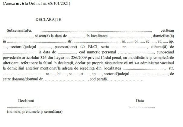 Măsura se va putea aplica după intrarea în vigoare a proiectului de ordin comun al Ministerului Sănătăţii şi CNAS, prin care cele două instituţii detaliază metodologia de punere în practică a acestei activităţi. Proiectul de ordin comun al MS şi CNAS, care abia a fost lansat în dezbatere publică, prevede, între altele, obligaţia oamenilor vaccinaţi anti-Covid-19 la domiciliu să completeze o declaraţie pe proprie răspundere pentru fiecare inoculare. Modelul acestei declaraţii este prevăzut în Anexa nr. 6 la proiectul de ordin.