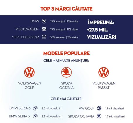 În topul modelelor, Volkswagen Golf domină cu 4.105 anunțuri, urmat de Volkswagen Passat și Skoda Octavia, fiecare cu câte 3% din anunțuri. La capitolul vizualizări, BMW Seria 3 atrage cele mai multe vizite cu peste 2,3 milioane de vizualizări, urmat de BMW Seria 5 cu 2,2 milioane și Volkswagen Golf cu 1,9 milioane. Dacia Duster ocupă locul 7, înregistrând peste 1,4 milioane de vizualizări și confirmând încă o dată poziționarea sa solidă în preferințele publicului autohton.