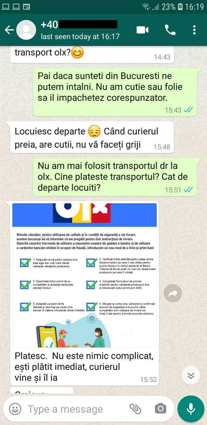 Ține conversațiile pe platforma de chat OLX/ platforma de vânzare-cumpărare, ca să te poți proteja de fraudatori. Dacă cineva îți cere să muți discuția pe WhatsApp sau îți ia numărul și îți scrie direct pe altă platformă, fii foarte atent. Cel mai bine este să îi spui să continuați conversația pe platforma de vânzare-cumpărare. Astfel, în cazul unei fraude, echipa de ajutor poate face investigații.