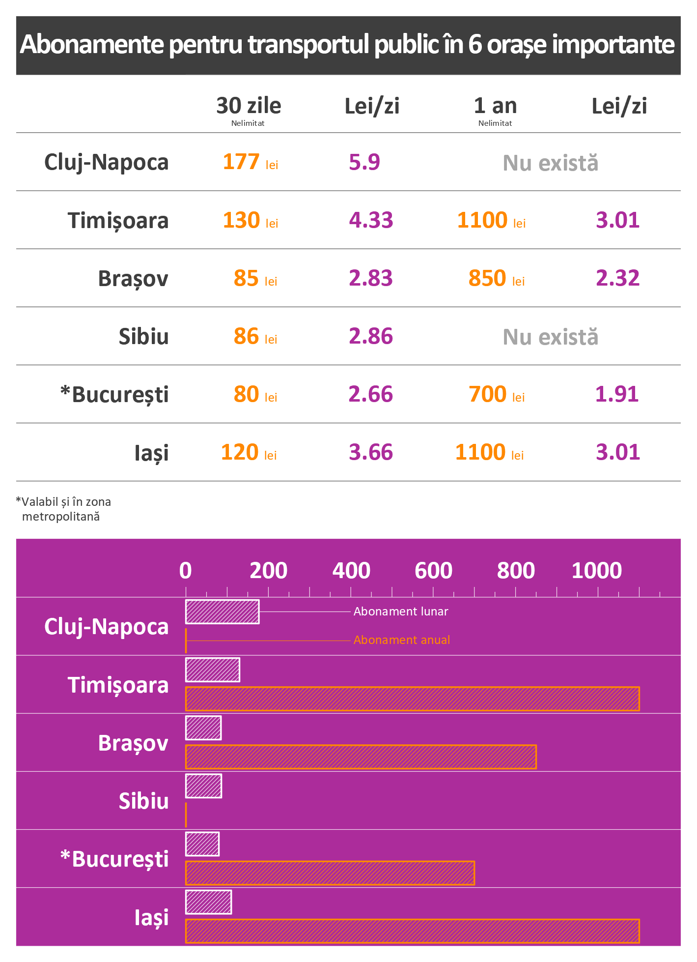 De asemenea, Cluj – Napoca este pe primul loc și când vine vorba de valoarea abonamentelor lunare. Astfel, un abonament lunar costă aici 177 de lei, față de 130 de lei în Timișoara sau 80 de lei în București, potrivit analizei menționate.