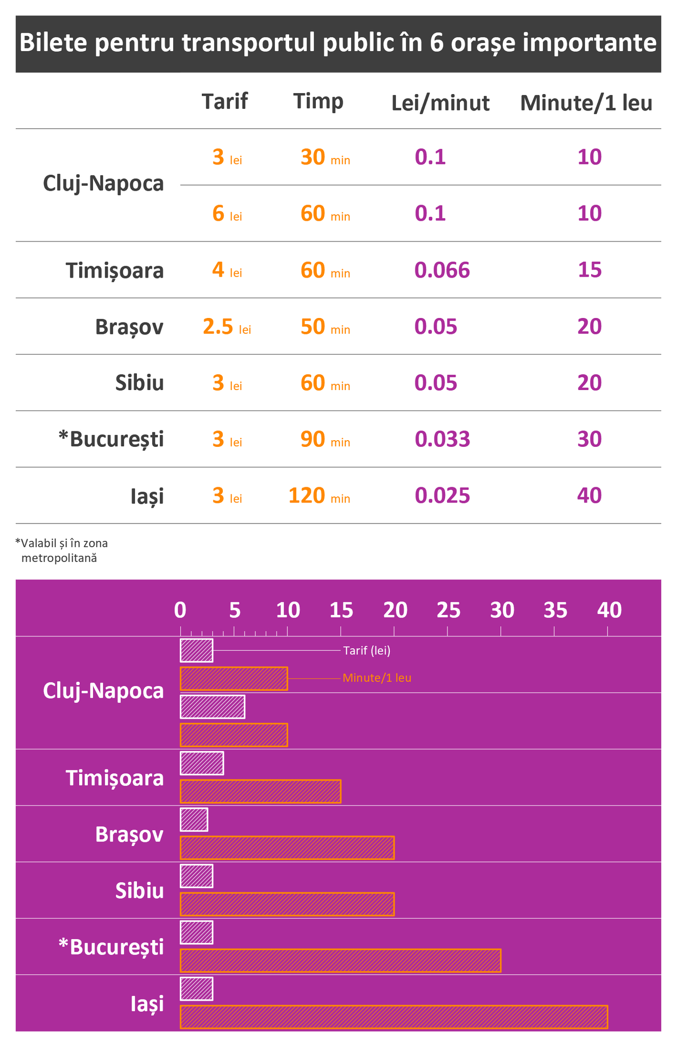 Potrivit unei comparații între șase mari orașe din țară, Cluj – Napoca ar avea cel mai scump transport public. Astfel, pentru un leu, poți călători 10 minute în Cluj, 15 minute în Timișoara, 20 de minute în Brașov și Sibiu, 30 de minute în București și 40 de minute în Iași.