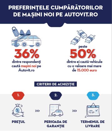 În ciuda scăderii evidente a apetitului românilor pentru mașini noi reliefată prin scăderile din ultimele luni, un studiu realizat de cea mai mare platformă online de tranzacții auto, Autovit, menționează „o creștere importantă în sectorul autoturismelor noi”. Mai exact, conform oficialilor acestui portal web, „36% dintre respondenți (n.n. – la studiul menționat) caută în mod activ mașini noi pe Autovit, iar peste 50% dintre acești utilizatori sunt interesați de autoturisme cu o valoare de peste 15.000 euro. Mai mult, conform studiului desfășurat la nivel național, peste 50% dintre aceștia intenționează să achiziționeze un vehicul în maximum 12 luni.”.