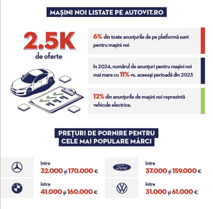 Platforma online Autovit a înregistrat o creștere de aproximativ 11% a numărului de anunțuri pentru mașini noi în perioada ianuarie – septembrie 2024, comparativ cu aceeași perioadă a anului trecut. În prezent, aproximativ 2.500 de oferte de mașini noi sunt listate pe site, reprezentând circa 6% din totalul anunțurilor.