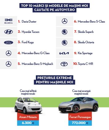 Cele mai căutate modele de mașini noi sunt Dacia Duster, Hyundai Tucson, Ford Kuga, Mercedes-Benz Clasa G, Mercedes-Maybach Clasa S, Mercedes-Benz Clasa S, Skoda Superb, Skoda Octavia, Kia Sportage și Toyota C-HR.