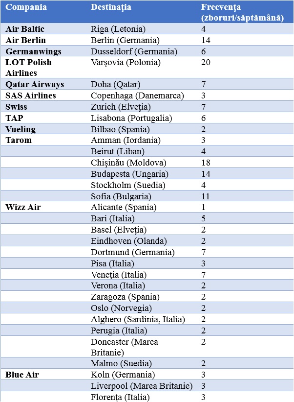Pe cea de-a doua poziţie se află Tarom, cu o frecvenţă de 18 zboruri săptămânale spre Chişinău, în timp ce pe locul trei se află companiile airBerlin, cu zboruri spre Berlin şi Tarom, cu zboruri spre Budapesta, ambele cu o frecvenţă de 14 zboruri săptămânale.
