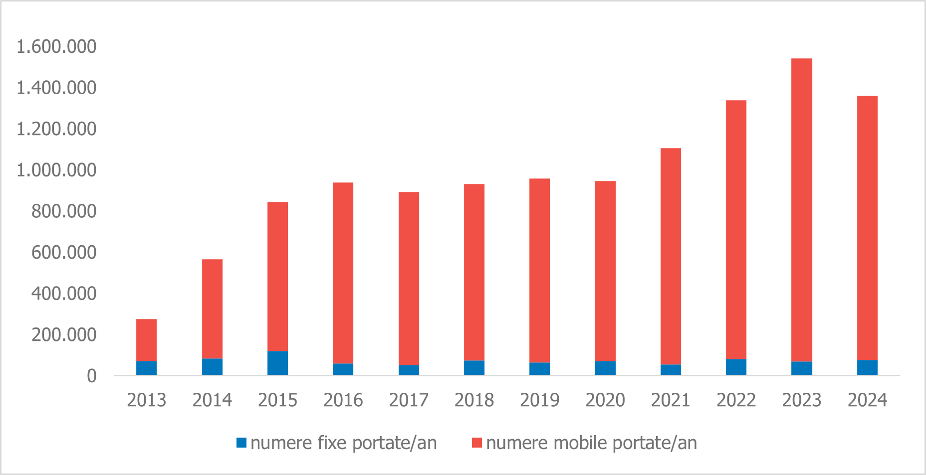 În 2024, din totalul numerelor de telefonie fixă portate, 28.002 au fost numere independente de locație, cu acces gratuit sau cu tarif special, indicând faptul că, deși telefonia fixă pierde teren în fața telefoniei mobile, utilizatorii continuă să păstreze servicii esențiale, cum ar fi numerele speciale, care rămân relevante pentru cei care aleg portabilitatea.