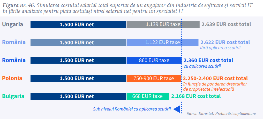 Graficul de mai jos, extras din studiul realizat de Roland Berger pentru ANIS și publicat în februarie 2022, relevă poziționarea României la nivel regional, la nivel de competitivitate în raport cu celelalte țări analizate în studiu. După cum se poate observa, eliminarea faiclității fiscale de care industria IT beneficiază va crește costul total cu salarizarea, ceea ce ne va poziționa în urma unor state precum Polonia sau Bulgaria.