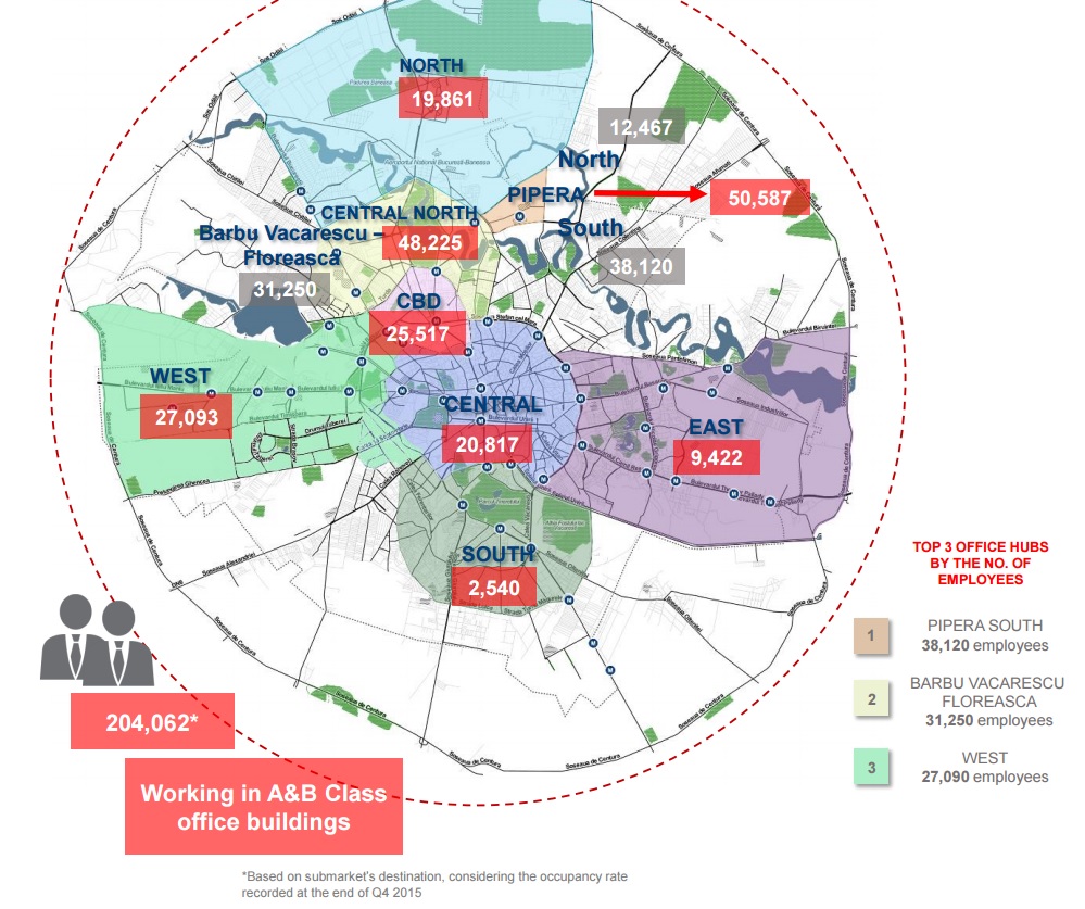 Numărul de angajați depășește 25.000 în zona de Vest și în Centrul de Business al Bucureștiului (Piața Victoriei – Aviatorilor). Zonele de birouri în care numărul de angajați este în jur de 20.000 sunt Centru și zona de Nord (Băneasa). Zonele cu cel mai mic număr de angajați care lucrează în spații de birouri clasa A și B sunt Est și Sud.