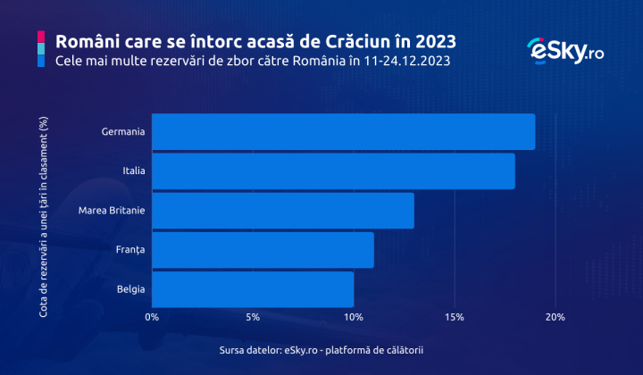 Specialiştii platformei de călătorii eSky.ro au analizat din ce țări se vor întoarce acasă cei mai mulți români în perioada Crăciunului, cât vor dura sejururile și cu cât timp înainte le-au rezervat.
