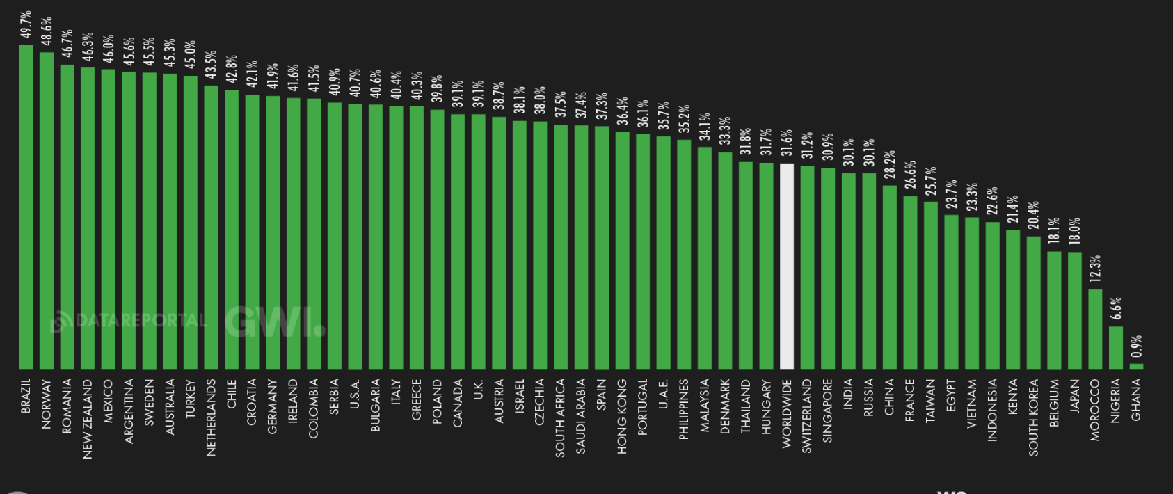 Media globală este de 31,6%, ceea ce înseamnă că România depășește cu peste 15 puncte procentuale nivelul mondial. Țara noastră se situează astfel înaintea unor piețe dezvoltate precum SUA, Marea Britanie, Germania sau Franța.