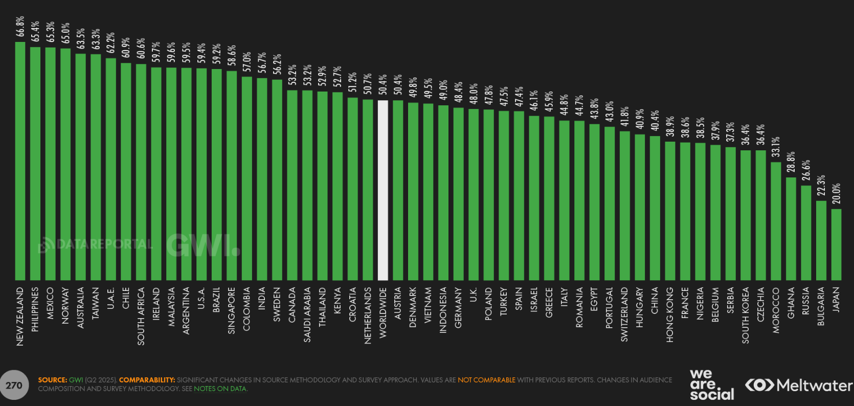 Potrivit datelor GWI, la nivel global, serviciile de streaming generează 50,4% din timpul total petrecut de utilizatorii de internet în fața televizorului. În România, ponderea este de aproximativ 44%, sub media globală și semnificativ sub nivelul din piețele lider precum Noua Zeelandă (64,8%), Filipine (65,4%) sau Mexic (65,3%).