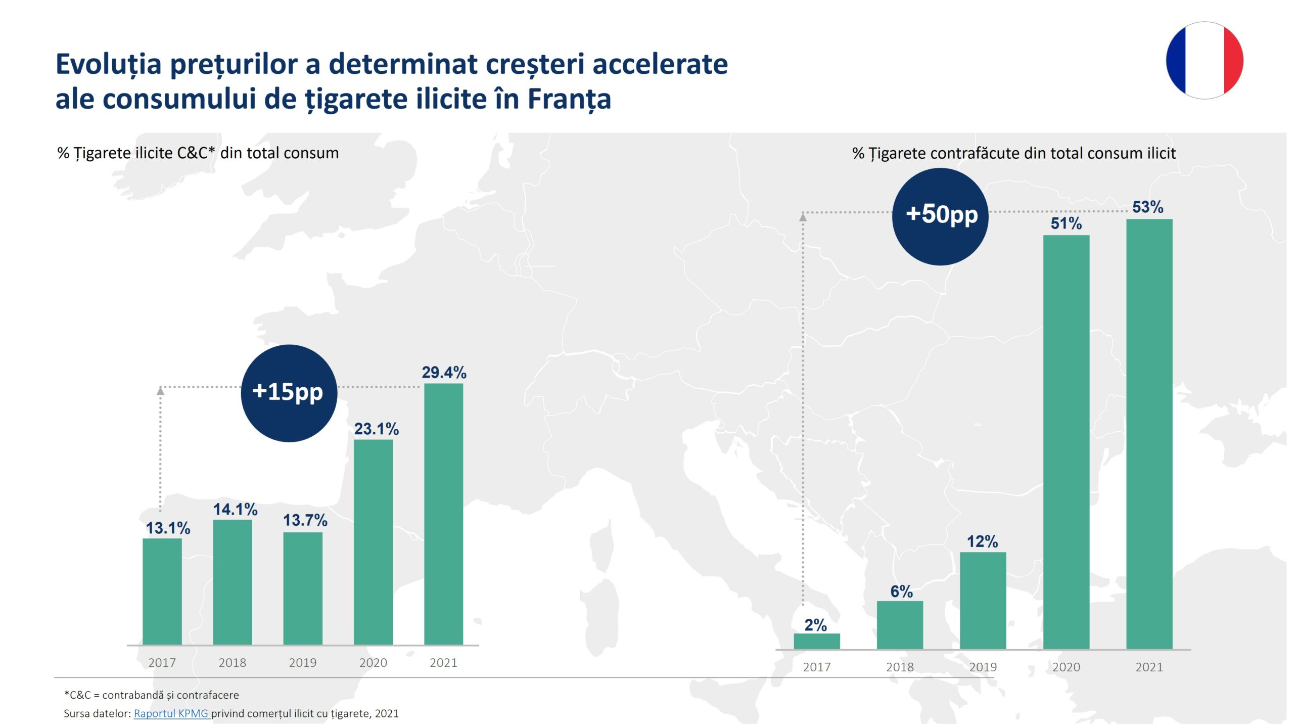 Conform raportului, creșterea consumului ilicit în UE a fost determinată în mare măsură de o creștere estimată de 33% a consumului de țigări contrafăcute în Franța, care s-a ridicat la 8 miliarde de țigări anul trecut. Franța rămâne cea mai mare piață pentru țigările ilicite din Uniunea Europeană, cu un total de 15,1 miliarde de țigări ilicite consumate în 2021. Acest volum reprezintă 29% din consumul total de țigări din Franța, ceea ce înseamnă o creștere semnificativă de la 13% în 2017.
