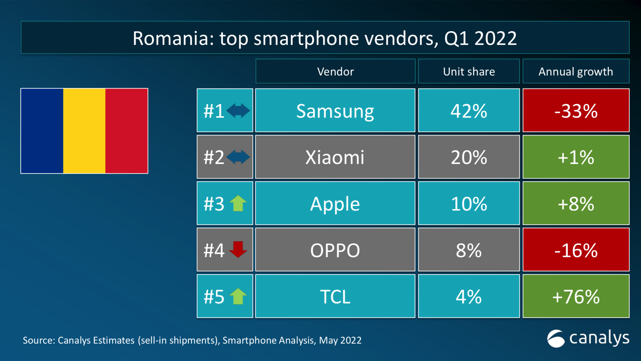 Samsung se impune din nou pe piaţa smartphone-urilor din România, cu o cotă de piaţă de 42%, în primul trimestru, potrivit datelor Canalys. Xiaomi își menține locul al doilea în topul producătorilor de telefoane inteligente din România.