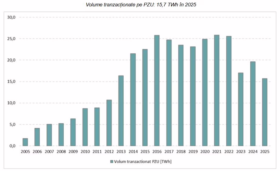 OPCOM arată cum au crescut volumele tranzacționate de-a lungul anilor: “Datele istorice anuale indică o evoluție a volumului tranzacționat pe acest orizont de timp de la 1,7 TWh în 2005, la 15,7 TWh în 2025, respectiv în valori medii orare de la 388,927 MWh/h în 2005, la 1.791,3 MWh/h în 2025, în procente din consumul intern de energie electrică această ultimă valoare reprezentând 32%”.