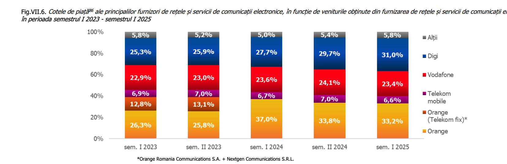 Orange rămâne lider după venituri, cu o cotă de 33,2% în semestrul I din 2025, însă aceasta este în scădere față de vârful de 37% din semestrul I din 2024.