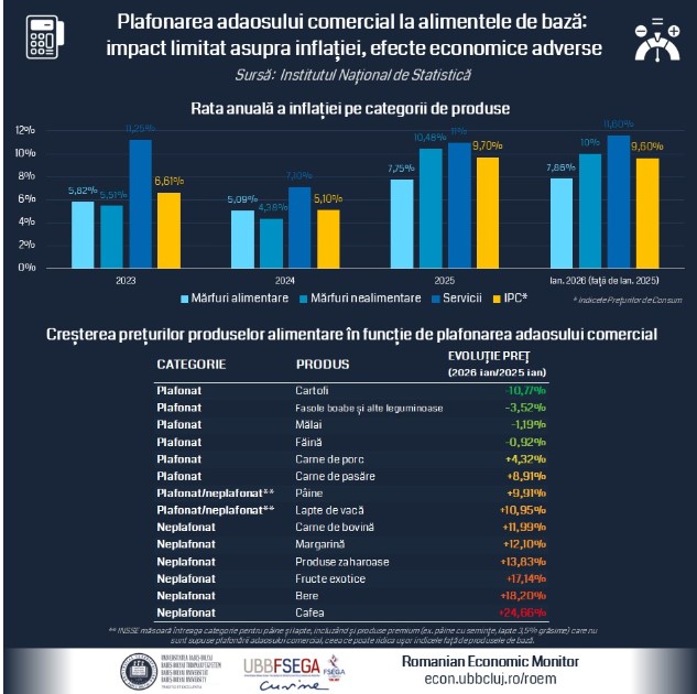 „Pe lângă plafonări, aceste scumpiri au fost și rezultatul creșterii costurilor materiilor prime pe piețele internaționale, cum este cazul boabelor de cafea. În același timp, această evoluție asimetrică sugerează și o reajustare a strategiilor de preț din partea retailerilor, care tind să compenseze limitarea marjelor de profit impusă pe alimentele de bază prin aplicarea unor adaosuri comerciale superioare asupra produselor nereglementate, transferând astfel presiunea inflaționistă către restul coșului alimentar”, spune Rácz Béla-Gergely, cercetător al echipei RoEM-UBB FSEGA.
