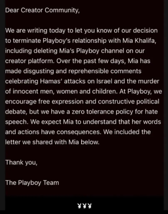 „Vă scriem astăzi pentru a vă anunța decizia noastră de a înceta relația Playboy cu Mia Khalifa, inclusiv prin ștergerea canalului Playboy al Miei de pe platforma noastră de creatori”, a scris „Echipa Playboy”, citată de NYPost.