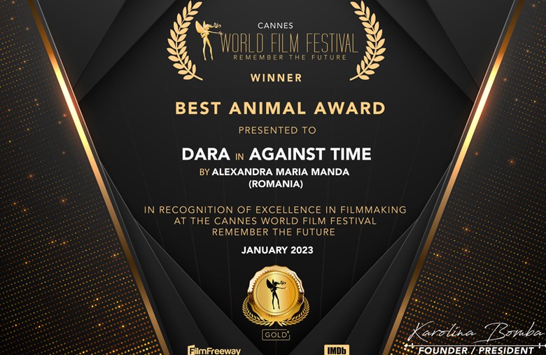 Filmul „CONTRA TIMP/AGAINST TIME” este laureat ca „Winner„ în cadrul festivalului Cannes WORLD FILM FESTIVAL REMEMBER THE FUTURE la două categorii: „Best Animal Award„ și „Best Original Song„ pentru competiția din luna ianuarie, 2023. Filmul este regizat și montat de Alexandra Maria Manda, studentă la Regie de Film și TV anul 1, clasa prof. univ. dr. Sabina Pop – Facultatea de Arte Hyperion, imaginea este semnată de Ion Sănduloiu-șef Salvamont Argeș și studenții Costin Dan și Matei Slisăreanu– specializarea Imagine de Film și TV, coordonata de conf. univ. dr. Vlad Leu – Facultatea de Arte Hyperion, iar piesa originală a filmului este compusă și cântată de Alexandra Duță – studentă în anul 1 la SNSPA, la Comunicare și Relații Publice.