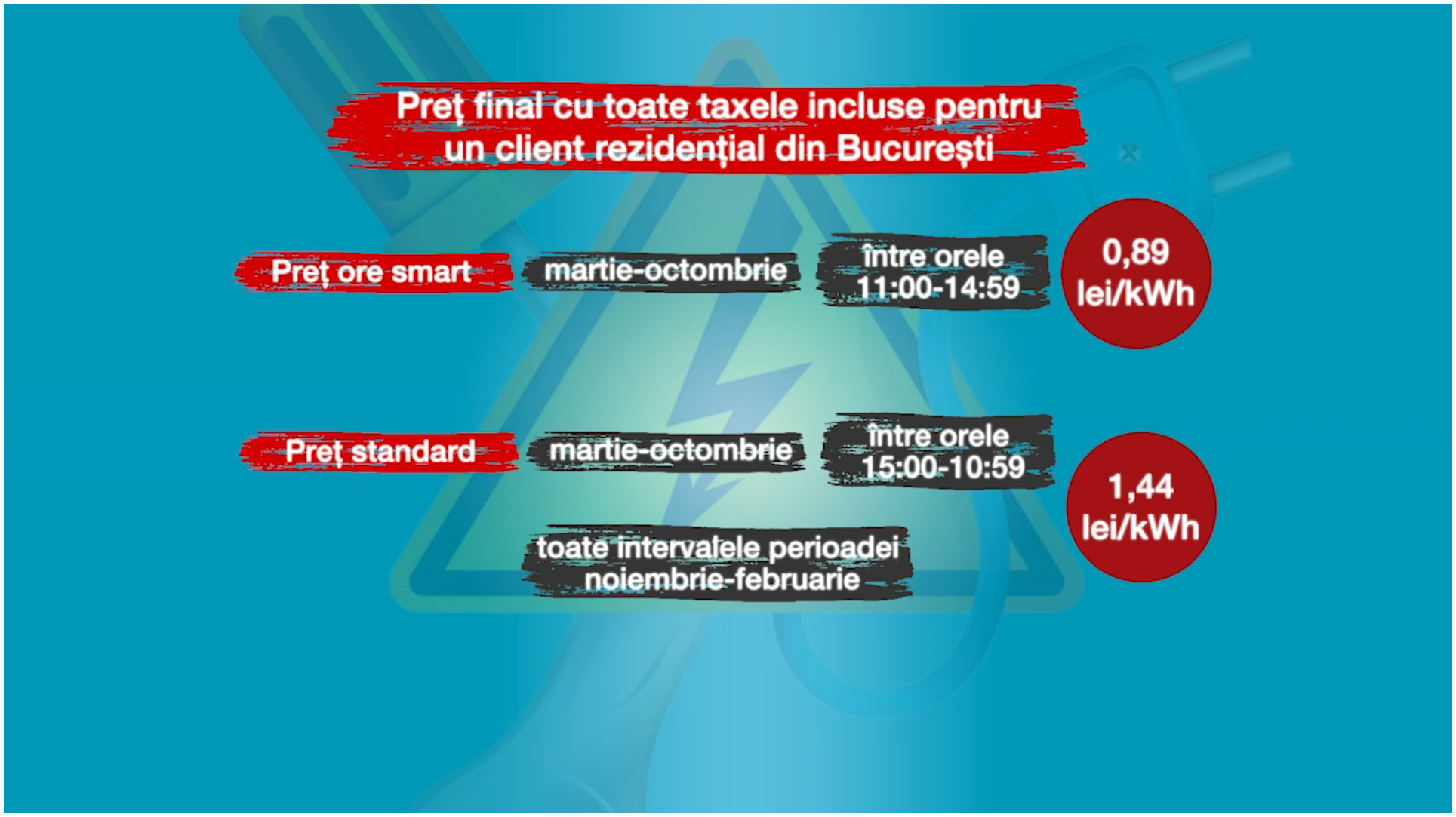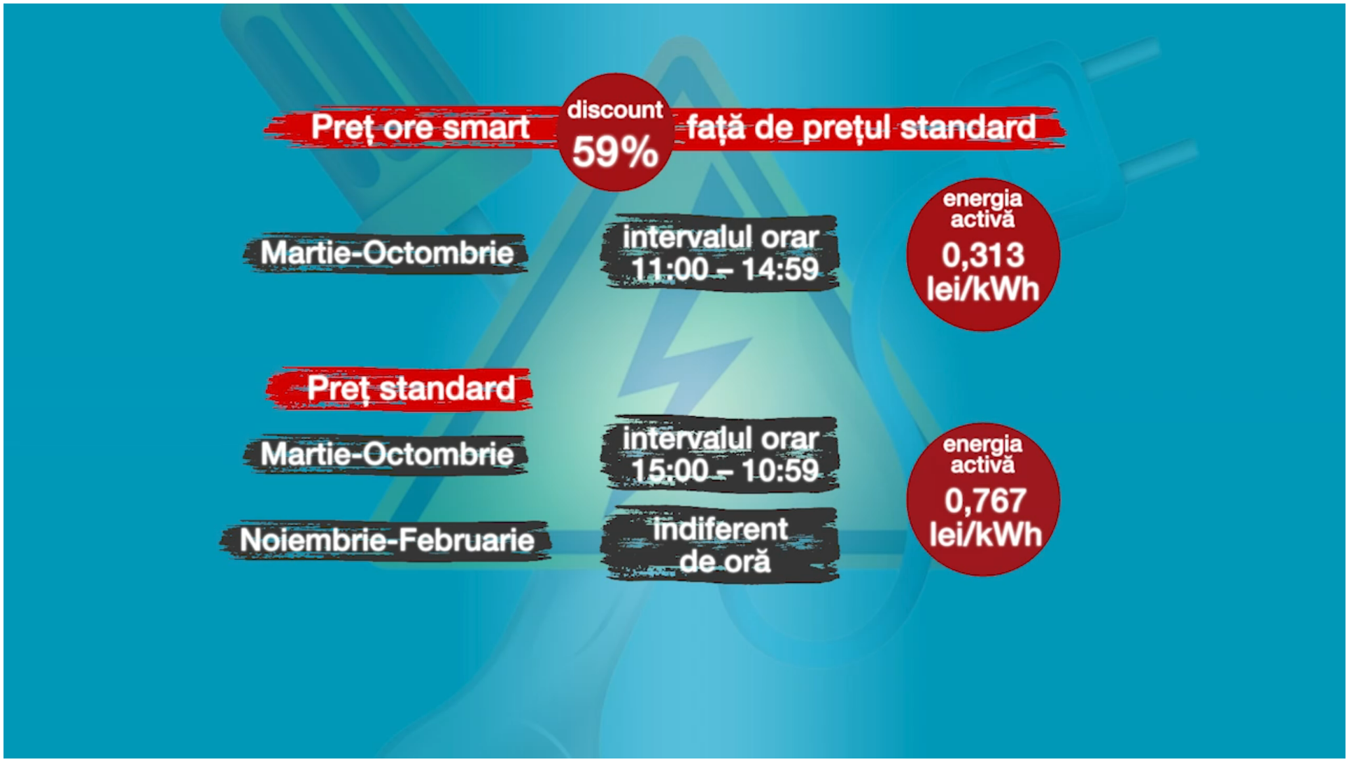 Între orele 11:00 și 14:59, în perioada martie-octombrie, prețul energiei electrice este cu până la 59% mai mic față de tariful standard din celelalte intervale orare. Pentru un consumator rezidențial din București, acest preț echivalează cu 0,89 lei/kWh, toate taxele incluse. În restul zilei și în perioada noiembrie-februarie, tariful cu toate taxele incluse este de 1,44 lei/kWh pentru același client din București.