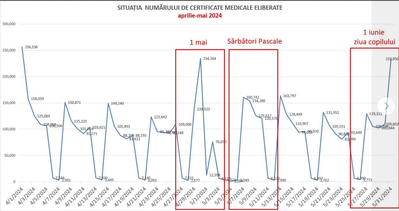 Avem concedii medicale extinse. Dacă vă uitați la statistică, o să vedeți că avem niște punţi în perioadele critice, între sărbători, și se vede un vârf de concedii programate exact patru zile și este evident că aceste lucruri invalidează statistica, nu te poți îmbolnăvi programat într-un număr atât de mare.