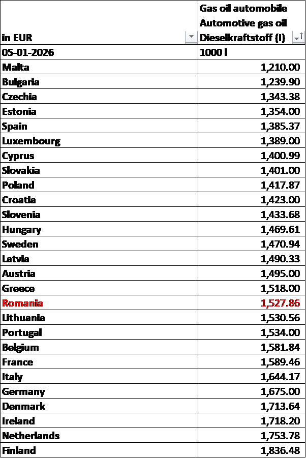 Potrivit aceleiași surse, la aceeași dată, prețul mediu al motorinei a ajuns în România echivalentul a aproape 1,53 euro pe litru. La fel ca în cazul benzinei, prețul cu toate taxele incluse este încă sub media europeană ponderată (1,545 euro), dar mult mai aproape de ea. Și în acest caz, România a ajuns, la fel, abia pe locul 17 în clasamentul european crescător al prețurilor. Motorina este astfel mai scumpă decât țările de lângă noi (Ungaria, Bulgaria),dar și mai scumpă decât cea din unele piețe vest-europene, cum ar fi Austria, Spania, Suedia și a ajuns chiar mai scumpă decât în Grecia. Clasamentul complet al prețurilor, în tabelul de mai jos