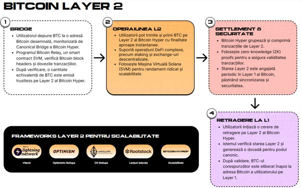 Înainte de toate, Bitcoin Hyper este o rețea secundară, care funcționează într-un sistem complementar cu cea Bitcoin, care efectiv preia tranzacții pe care le procesează mai repede și la costuri semnificativ mai mici, fără să sacrifice securitatea.