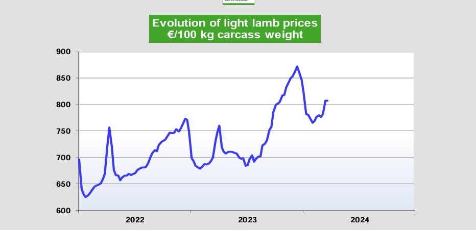 La nivelul UE, prețul mediu la poarta fermei al carcasei de 100 de kilograme de miel sub 13 kilograme era de 807,6 euro, cu 3,5% mai mare decât luna anterioară.