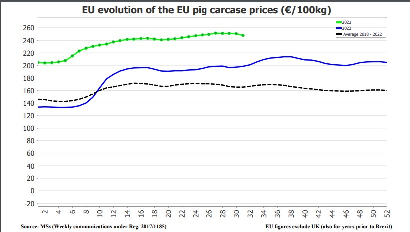Prețul carcasei de 100 de kilograme de porc, tip S, a scăzut în ultima săptămână din iulie sub pragul de 270 de euro (268,8 euro), după opt săptămâni în care s-a atins inclusiv pragul de 284 de euro, arată ultimele date ale Comisiei Europene care exprimă o medie a prețurilor la poara fermelor europene.