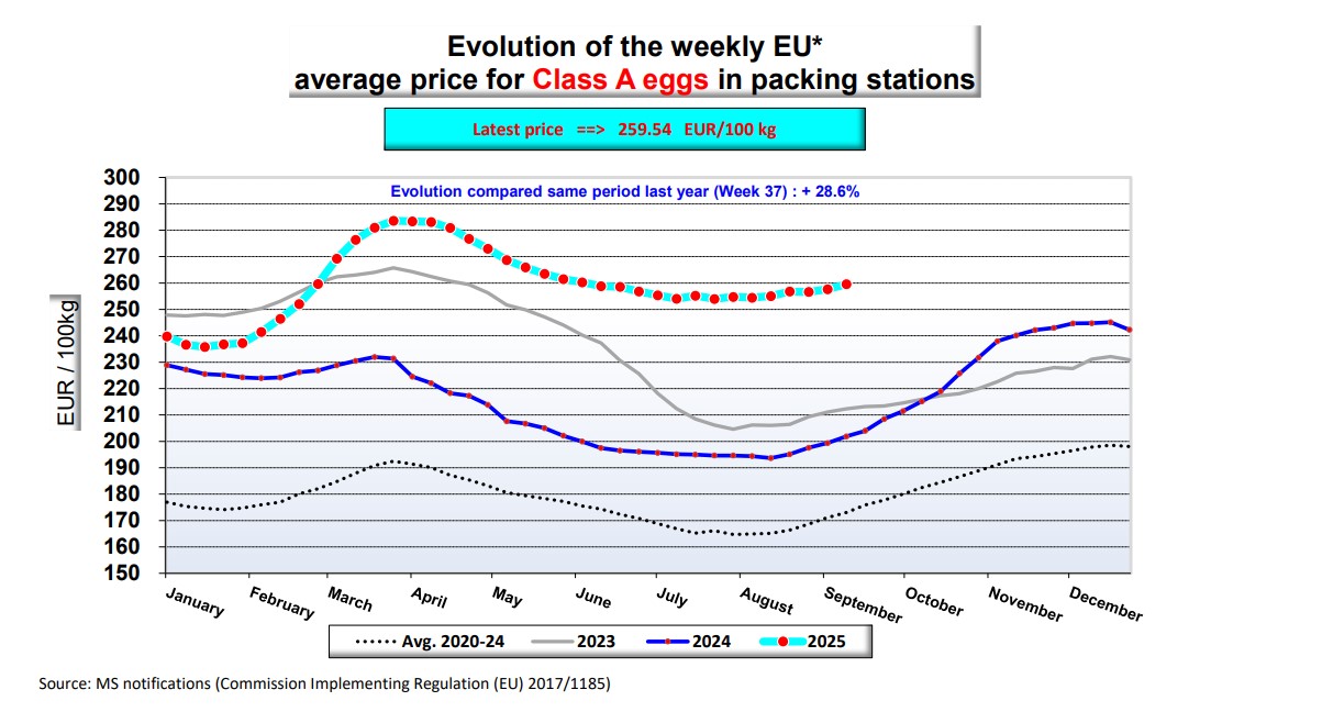 Ouăle au început să se scumpească din nou în toată Europa, după o scurtă perioadă de stabilizare de câteva săptămâni, arată datele Comisiei Europene aferente perioadei 8-14 septembrie. Prețul mediu la poarta stațiilor de ambalare a ouălor categoria A a ajuns la 259,5 euro suta de kilograme, după o creștere de 0,7% față de săptămâna anterioară, de 1,8% raportat la luna anterioară și de 28,6% față de perioada similară a anului trecut.