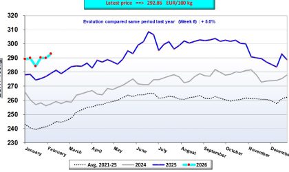 În România, producătorii au practicat prețuri medii de 222,94 euro suta de kilograme, cele mai mari din noiembrie 2025 încoace, după scumpiri de 2,3% față de săptămâna anterioară și cu 1,7% raportat la luna anterioară. Este a doua cea mai mare scumpire din UE, după Polonia, dacă analizăm evoluția săptămânală a prețurilor. Totuși, prețul este cu 0,6% mai ieftin decât în perioada similară a anului trecut.