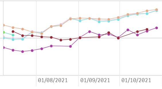 Prețul grâului în România (mov și grena), Franța (albastru deschis, lila), Polonia (verde, bleu, roz deschis), Germania (roz)