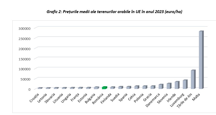 Comparativ cu celelalte state UE, suntem al nouă-lea cel mai ieftin stat din 21 de state membre pentru care există date, în contextul în care prețul mediu al unui hectar de teren arabil în Europa a înregistrat variații semnificative. Prețurile terenului arabil au fluctuat între un minim de 4.491 euro/ha în medie în Croația și un maxim de 283.039 euro/ha în medie în Malta, în timp ce în România prețul mediu a fost de 8.414 euro/ha.