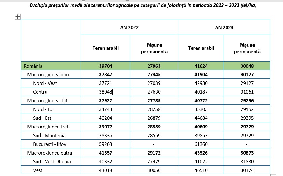 Ca trend, INS consemnează o scumpire medie de 4,8% a preţului mediu pentru terenul arabil, cea mai însemnată creștere fiind observată în Regiunea de Nord- Vest a României (+13,9%). Preţul mediu al păşunilor permanente a înregistrat o creștere, pe total ţară, de aproximativ 7,5% în anul 2023, față de anul anterior, cea mai importantă creștere fiind în Regiunea Sud-Vest Oltenia (+15,8%).