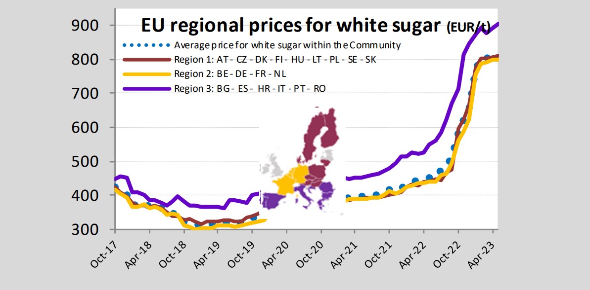 Prețul mediu al zahărului alb în regiunea 3 a Europei, din care fac parte România, Bulgaria, Estonia, Italia, Ungaria și Portugalia, a ajuns în luna mai la 903 euro tona, un record al ultimilor șase ani, arată ultimele date ale Comisiei Europene. Este mai scump decât în celelalte regiuni ( Regiunea 1 – 809 euro tona și Regunea 2- 800 de euro) și cu 99% peste media din mai 2021. De asemenea, față de aprilie prețul este cu 1,2% mai mare, iar față de ianuarie 2023 cu 3,4.