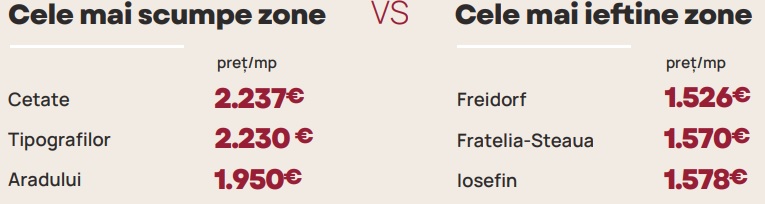 Prețul mediu solicitat pentru apartamentele scoase la vânzare în Timișoara a ajuns până la finele lunii septembrie la 1.845 euro/mp util, cu 11% mai mult față de acum un an. Cea mai scumpă zonă este Cetate, cu 2.237 de euro/mp, iar la polul opus Freidorf, cu 1.526 de euro/mp.