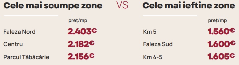 La Constanța, prețul mediu stă încă sunt pragul de 2.000 de euro, iar cea mai scumpă zonă este Faleza Nord, cu 2.400 de euro, iar la polul opus, în zona Km 5 prețul mediu este mai mic cu 1.000 de euro față de cea mai scumpă zonă.