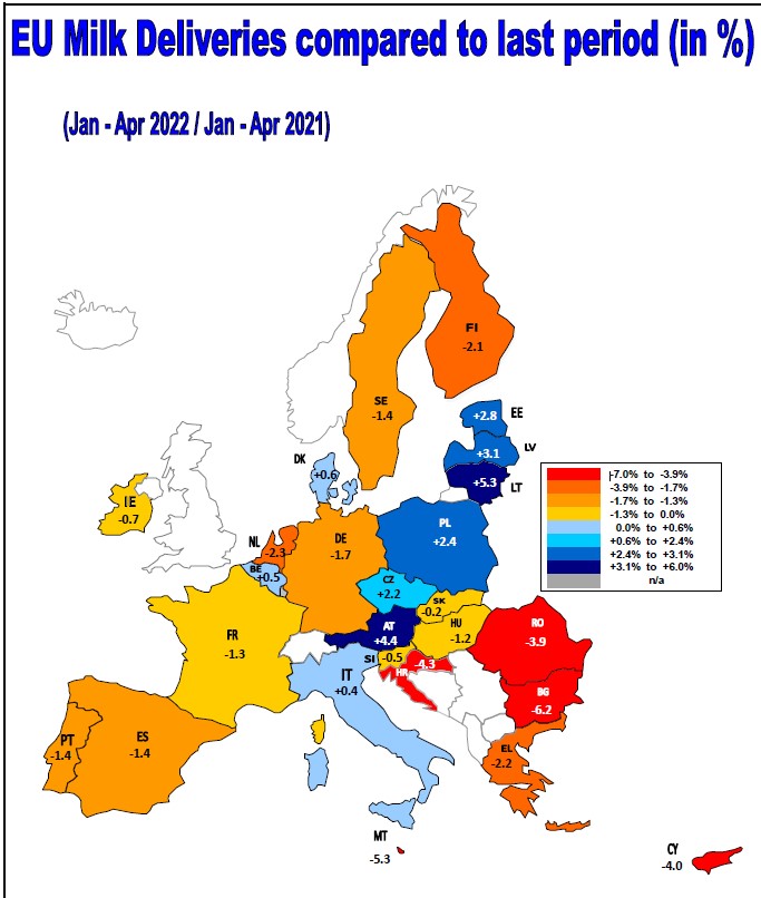 Cum și efectivul de vaci de lapte este mai mic (-1%), se așteaptă, prin urmare, ca livrările de lapte din UE să scadă cu 0,6% în 2022. În România, în perioada ianuarie-aprilie, livrările de lapte crud de la fermieri au scăzut deja cu 3,9%, a doua cea mai mare scădere după Bulgaria (minus 6,2%).