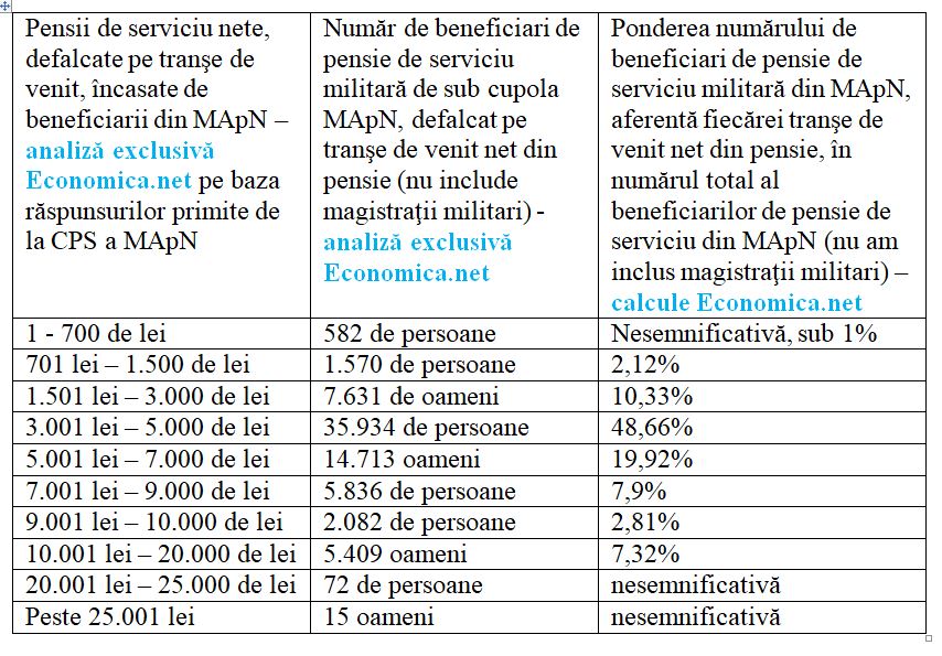 Puţin peste 10% dintre beneficiarii de pensie de serviciu plătiţi de CPS a MApN – adică 7.631 de oameni – au avut pensie netă între 1.501 lei şi 3.000 de lei, în octombrie, conform analizei Economica.net.