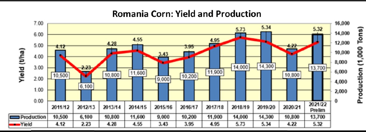 „Porumbul din România a beneficiat de precipitații favorabile în zonele din sud și sud-est. Între timp, în vest, în regiunile din jurul Timișoarei și Aradului, producțiile au fost moderate din cauza căldurii și a uscăciunii, împiedicând astfel creșterea în continuare a randamentelor naționale. (…) Din cauza primăverii răcoroase și umede care a întârziat progresul culturilor de vară, recolta va începe mai târziu decât obișnuit în 2021/22. Porumbul este recoltat de obicei din septembrie până în noiembrie”, se menționează în raport.